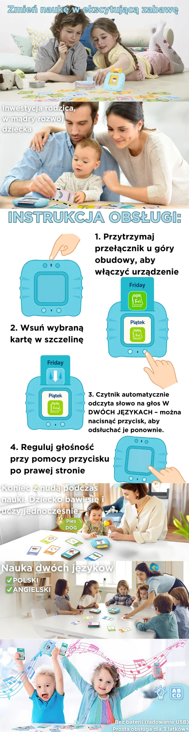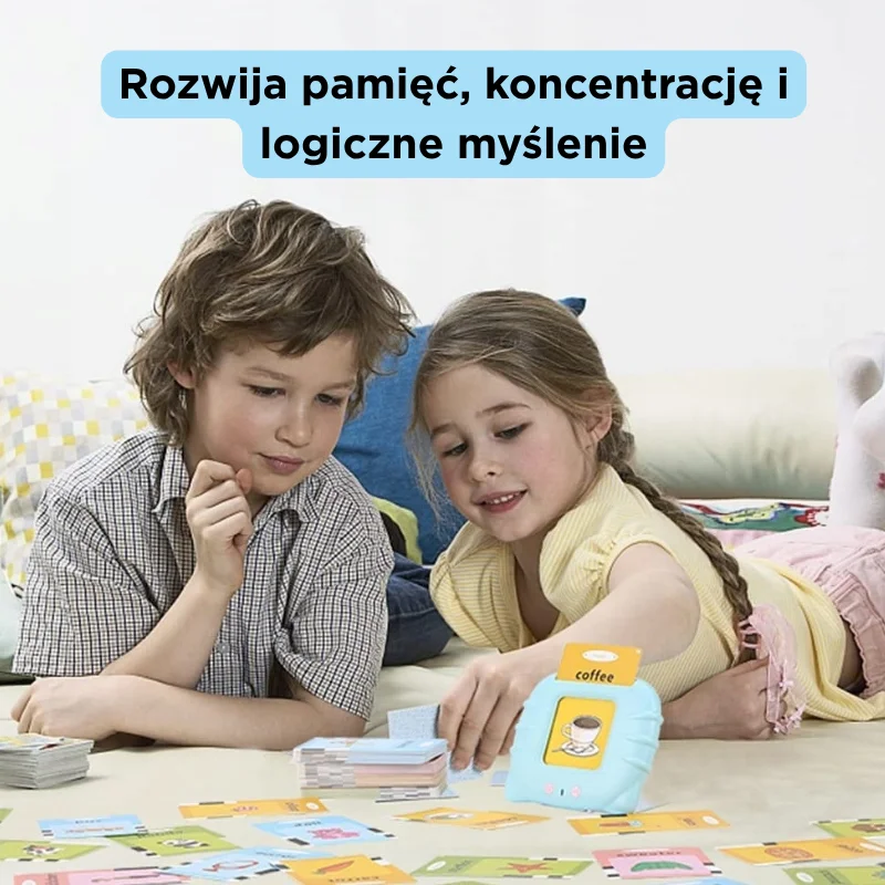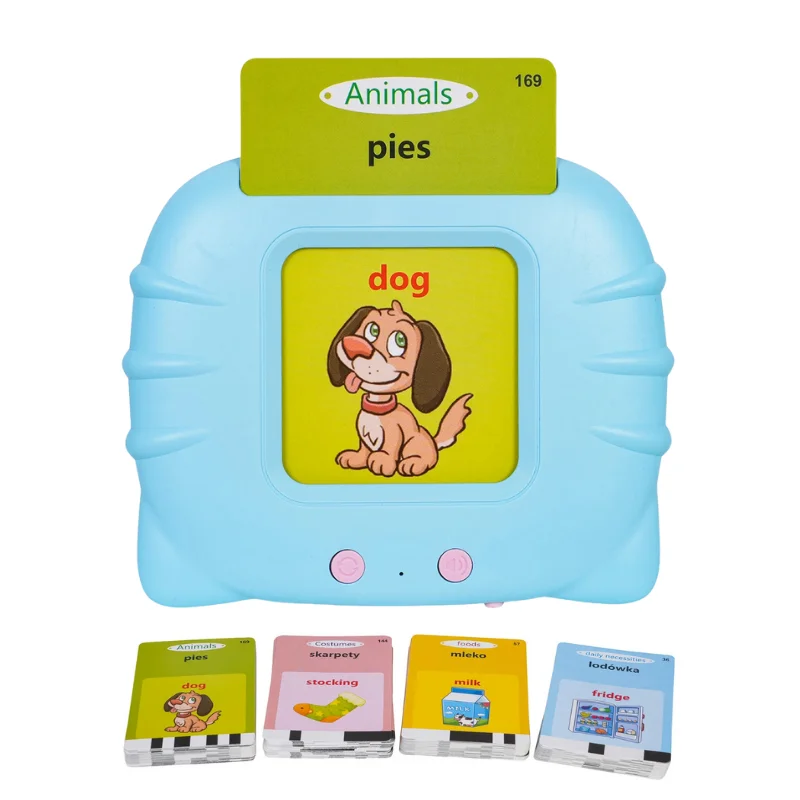 Tak, obsługa jest bardzo prosta – wystarczy wsunąć kartę, a urządzenie samo odczyta słowo. Dziecko szybko uczy się, jak zmieniać karty i powtarzać słówka. To intuicyjna zabawka, która nie wymaga pomocy dorosłych.