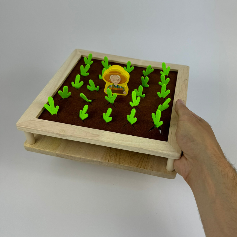Zestaw oferuje z jednej strony drewnianą planszę do gry w kulki, a z drugiej memory farm. Do memory dołączone są karty, które wskazują, co znaleźć w ogródku.