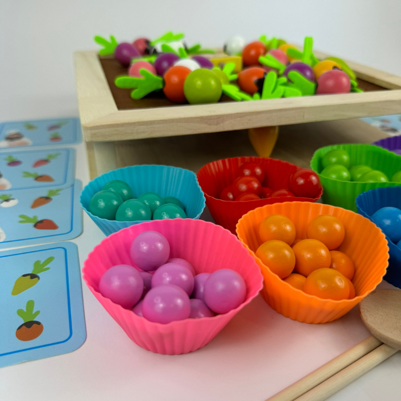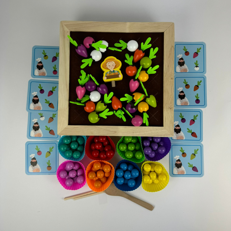 Na początku sadzimy warzywa, dziecko w tym czasie zapamiętuję gdzie i jakie zostały posadzone. Następnie losuje karty i próbuje zbierać z ogródka warzywa, które znalazły się na karcie.