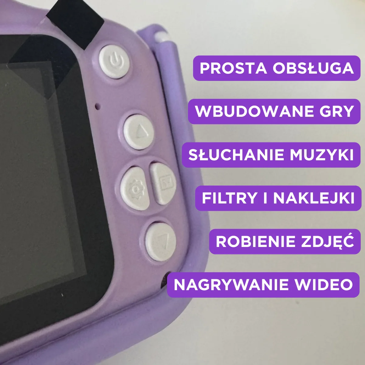 Projektanci aparatu zadbali, by obsługa była dziecinnie prosta – dosłownie. Menu wyświetla się po polsku, ikonki są czytelne, a każdy przycisk jest duży i wyróżniony symbolami. Nawet trzylatek szybko zrozumie, jak zrobić zdjęcie czy przełączyć tryb.