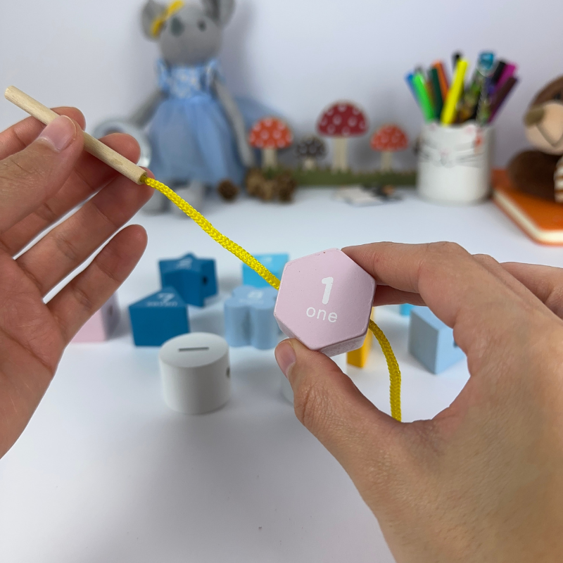 - Zabawa poprzez nawlekanie uczy cierpliwości. Jest to świetne rozwiązanie na zainteresowanie dziecko. Zadaniem dziecka jest nawleczenie każdego elementu na sznureczek.