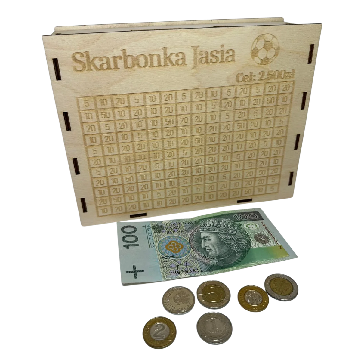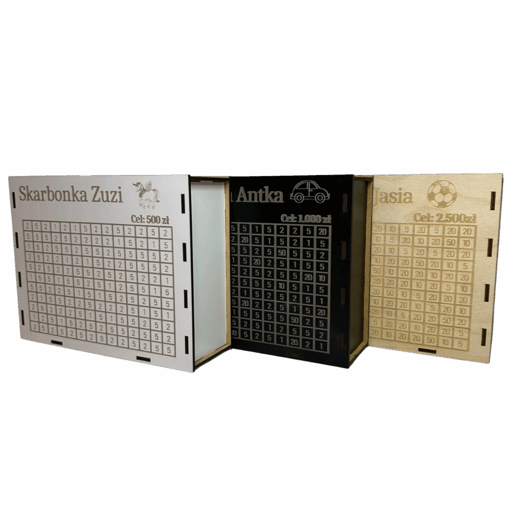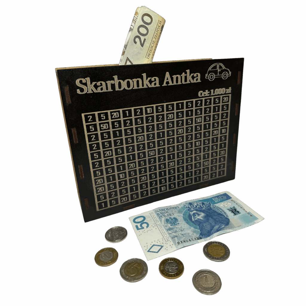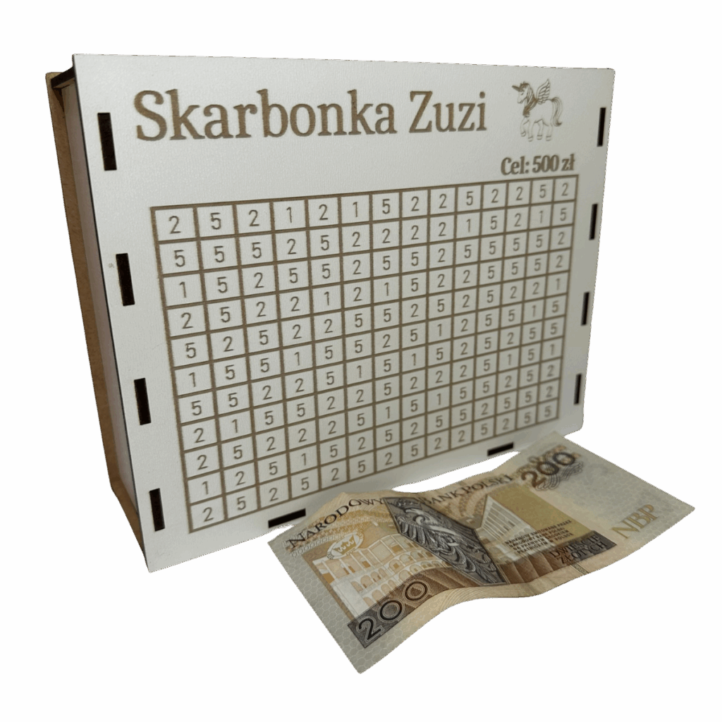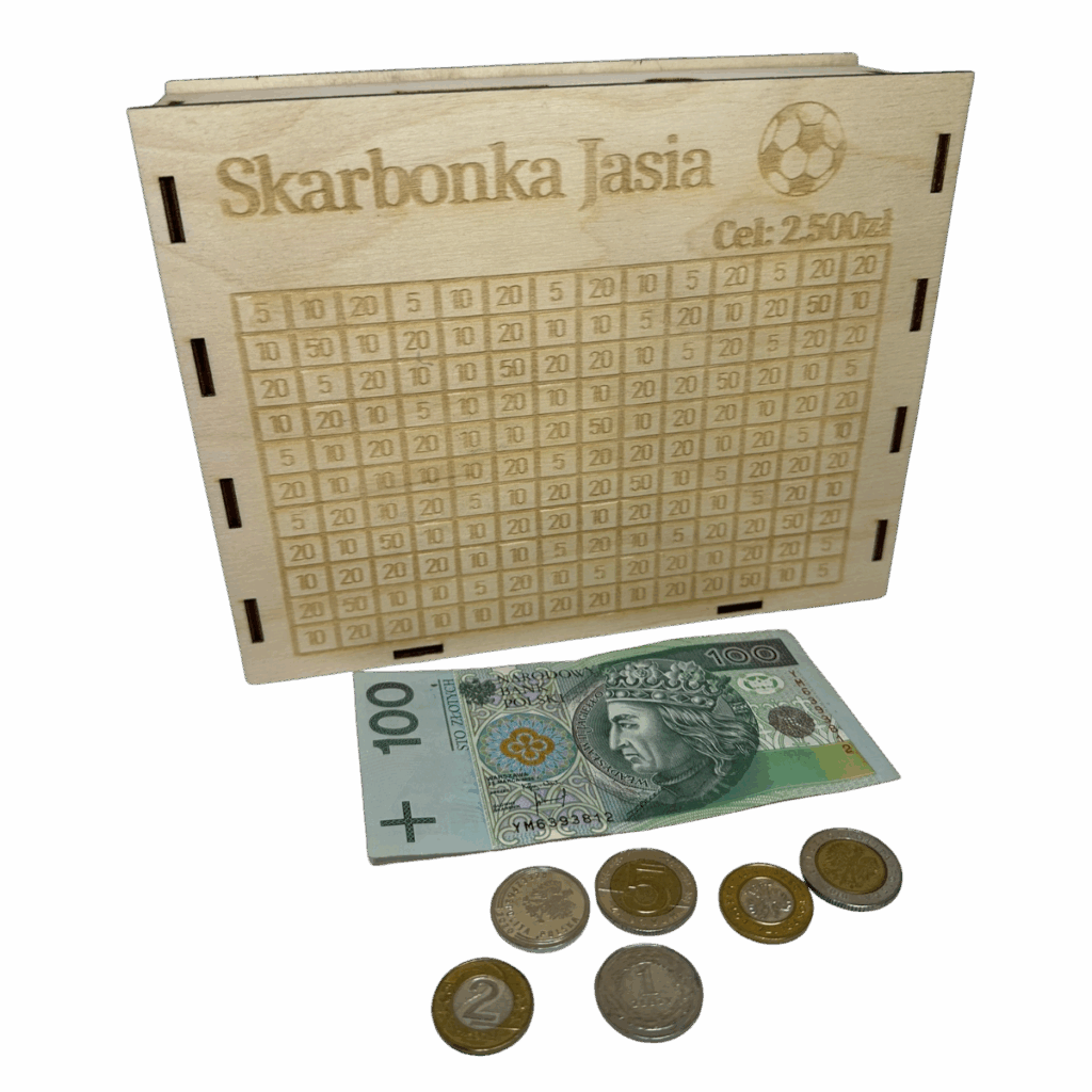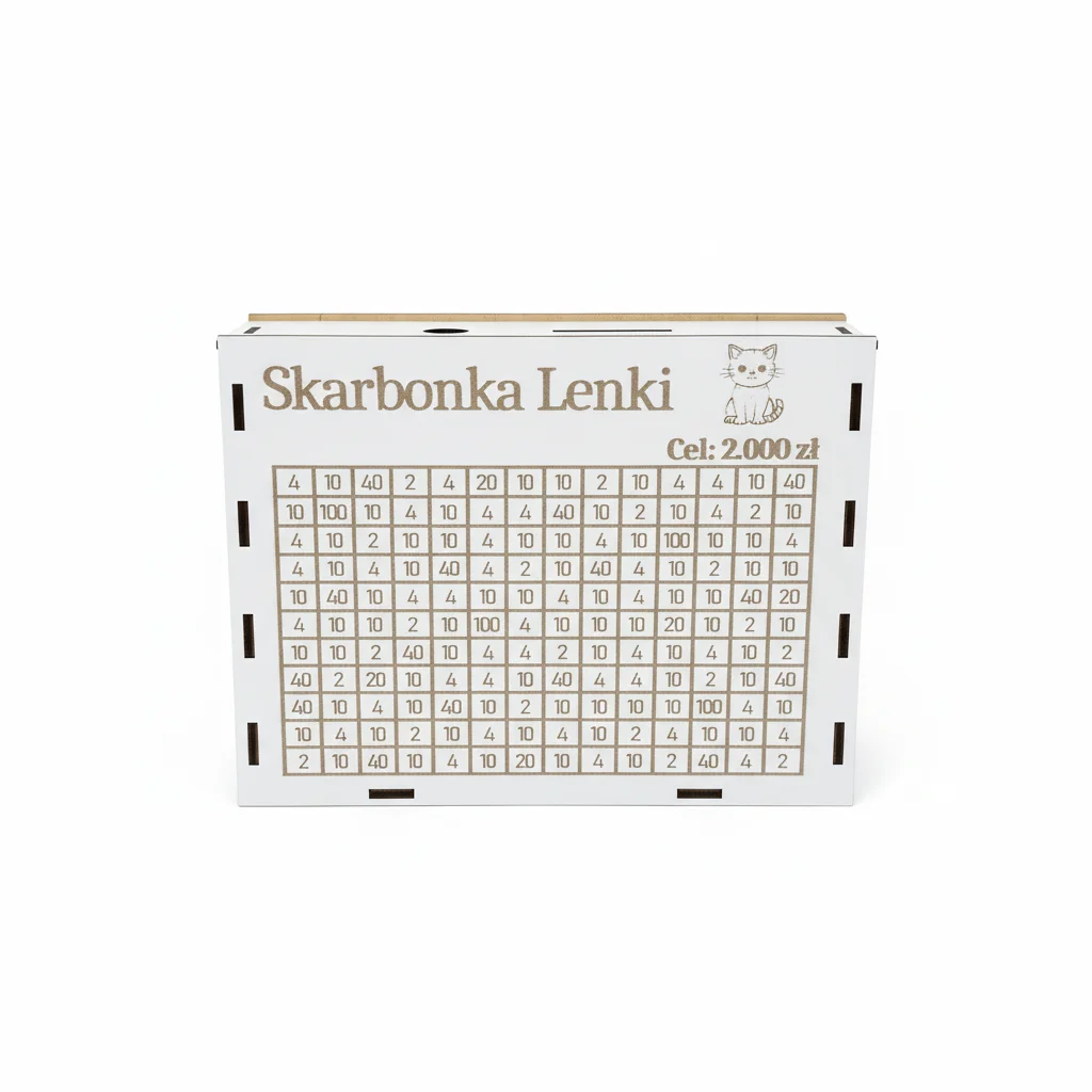 - Możliwość wygrawerowania imienia lub dowolnego celu oszczędzania, np. "Skarbonka Zuzi" czy "Na zabawki".