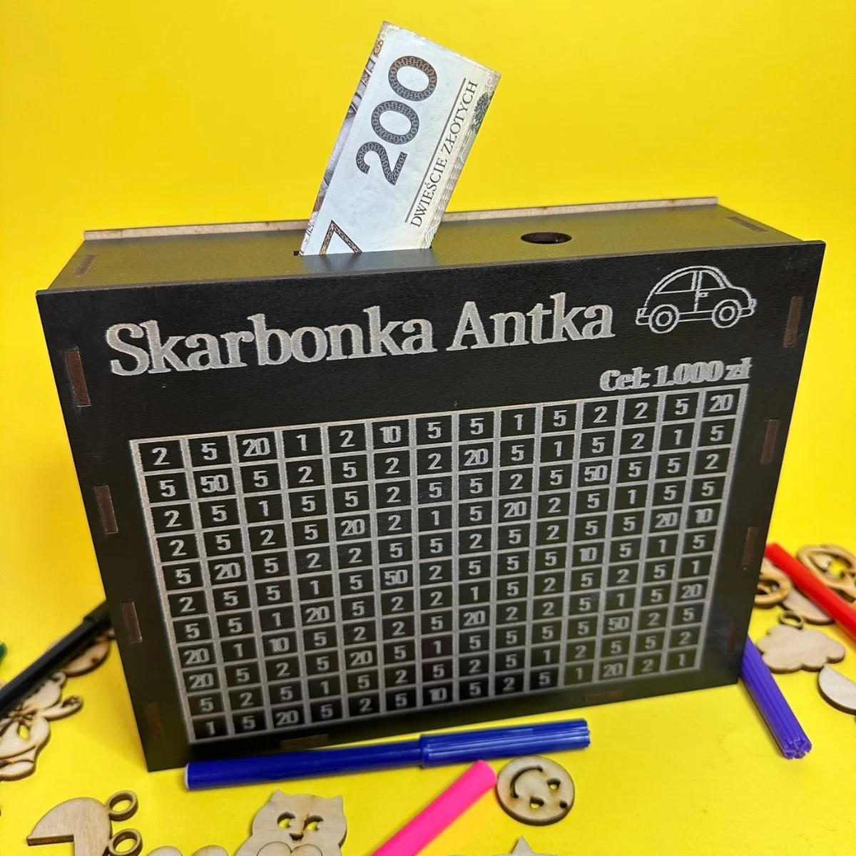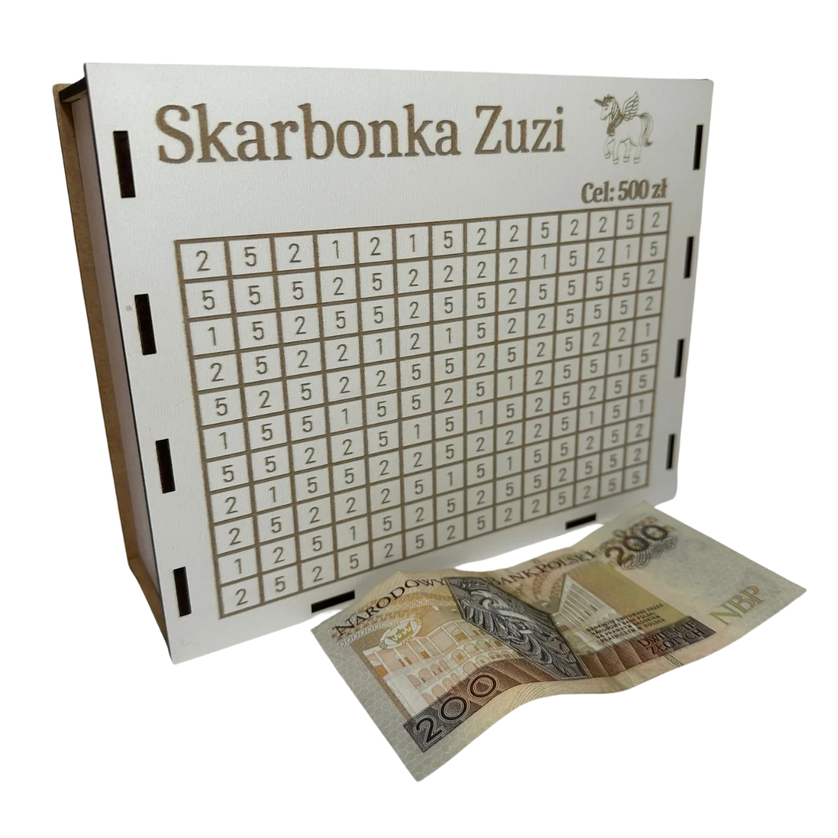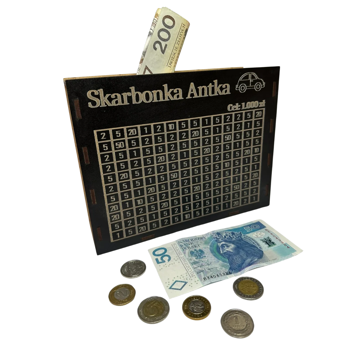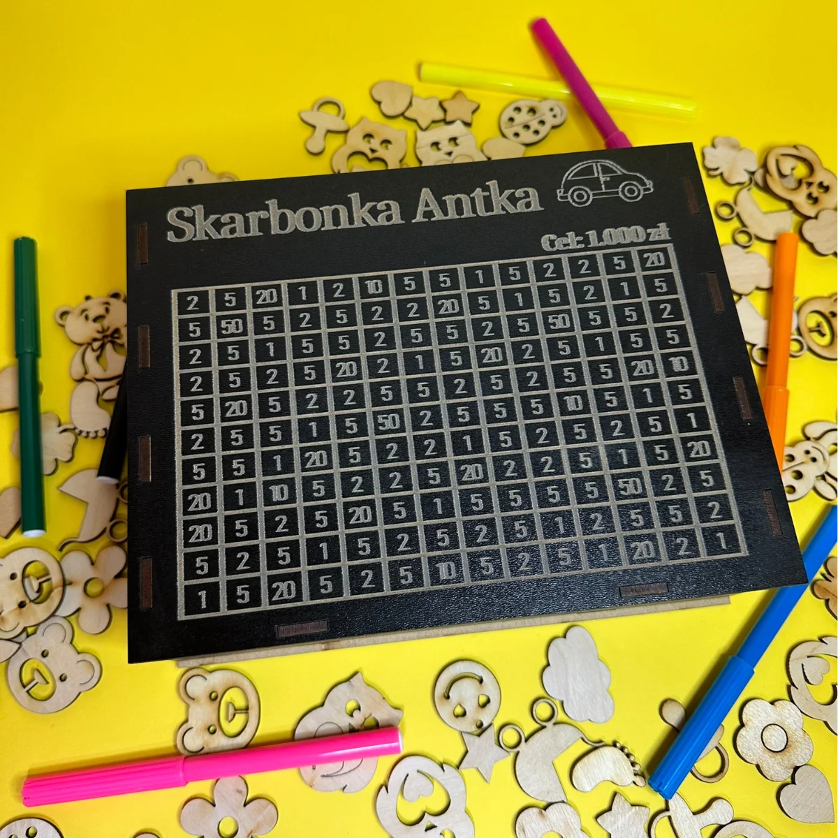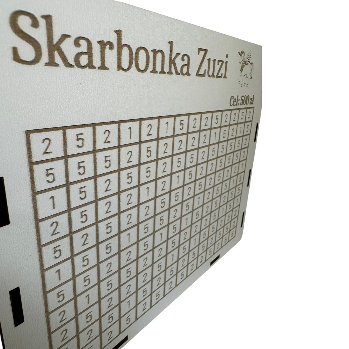 - Możliwość wygrawerowania imienia lub dowolnego celu oszczędzania, np. "Skarbonka Zuzi" czy "Na zabawki".